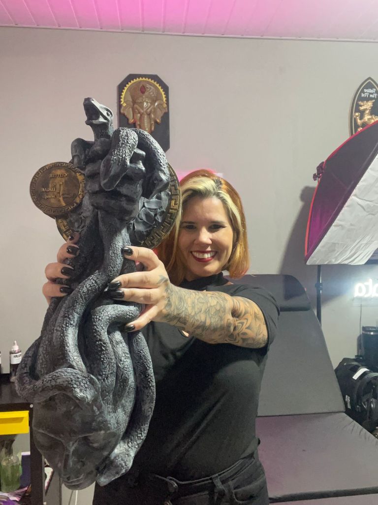 Sou tatuadora há 3 anos, comecei a tatuar do zero com a mentoria do meu marido, o tatuador Magnata. Com muita dedicação, me apaixonei pela profissão. Sou tatuadora somente de artes femininas e, hoje, sou especialista e premiada na categoria. Há 2 anos desenvolvo um trabalho de cobertura de tatuagens e cicatrizes em mulheres, devolvendo a autoestima. É gratificante fazer parte de um momento tão especial na vida tantas mulheres.